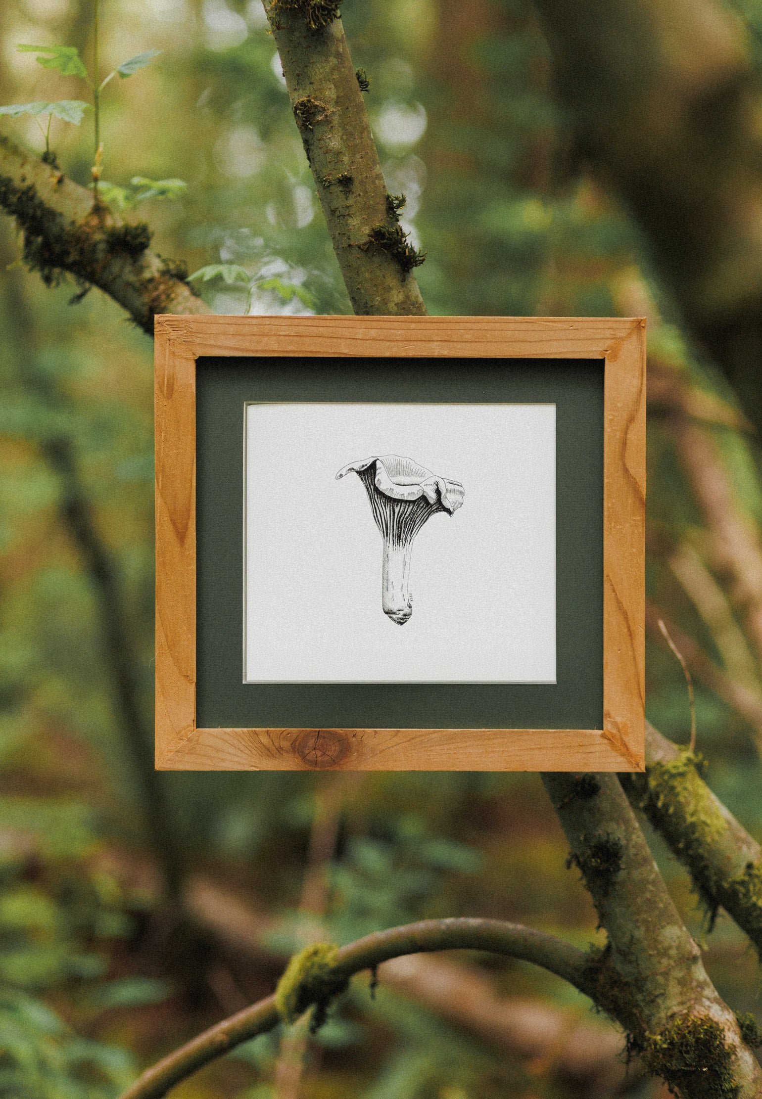 A finely detailed pen and ink illustration of a chanterelle, printed on 8" x 10" Natural 190gsm, 100% cotton paper. This acid-free paper has a smooth, matte finish with no optical brighteners, ensuring a warm, off-white tone. Printed using archival-quality matte black ink for lasting depth and clarity.